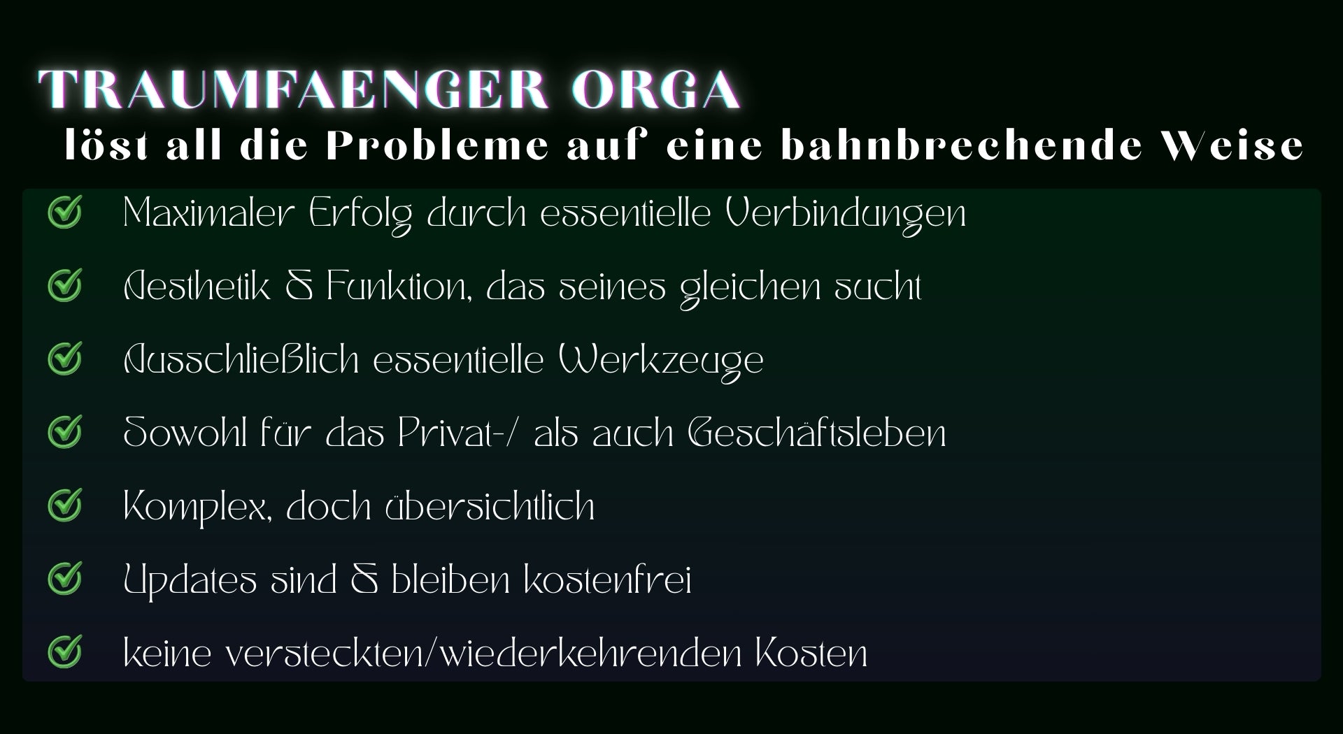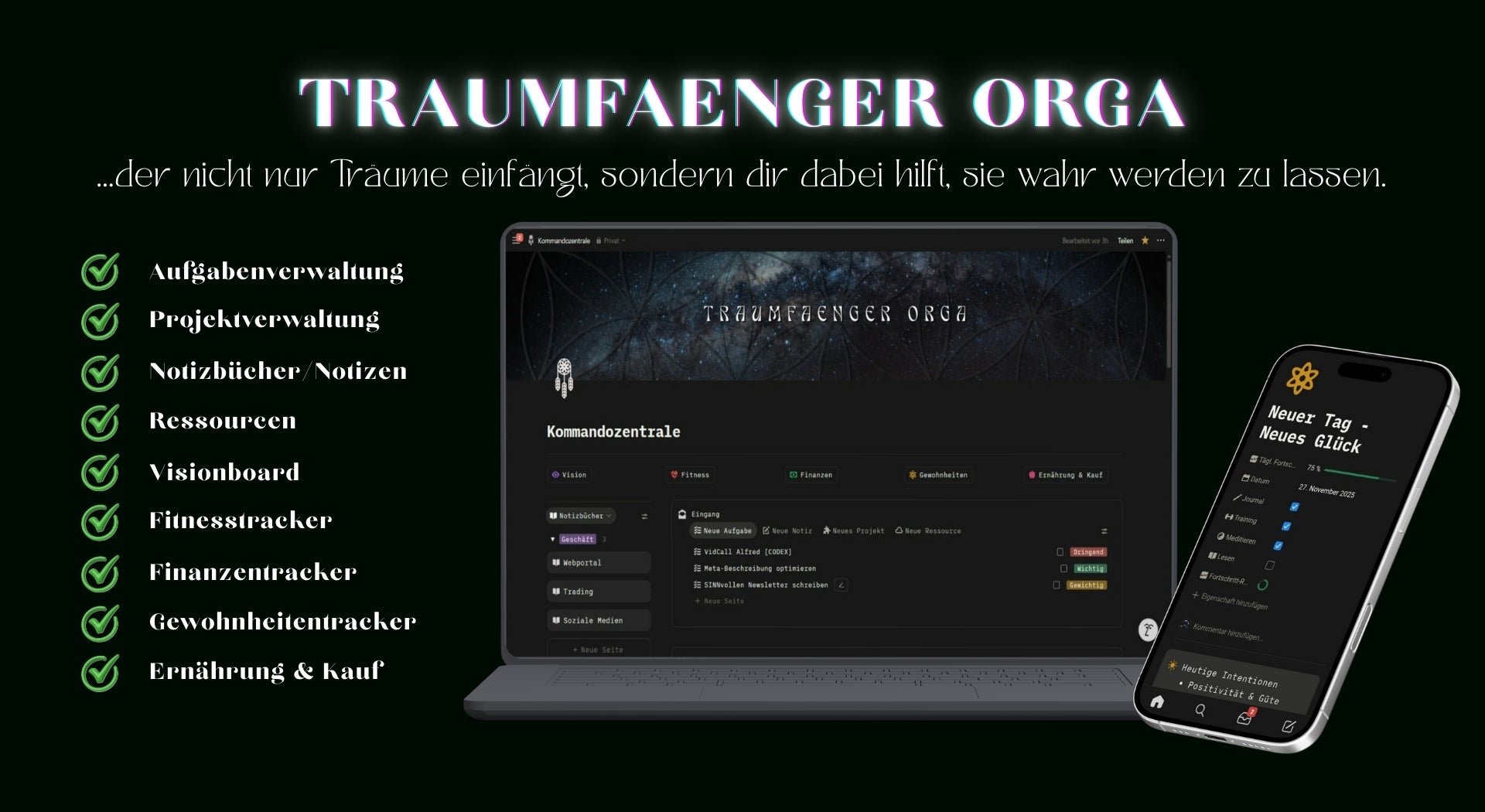 Ja, du kannst das gesamte System ohne Einschränkungen nutzen & alle Funktionen voll ausschöpfen. Registriere dich bei Notion & integriere TRAUMFAENGER ORGA.